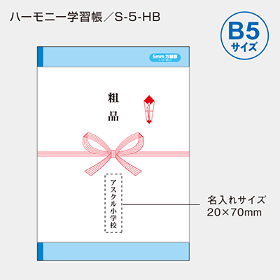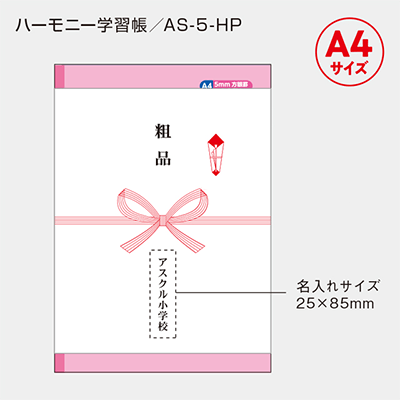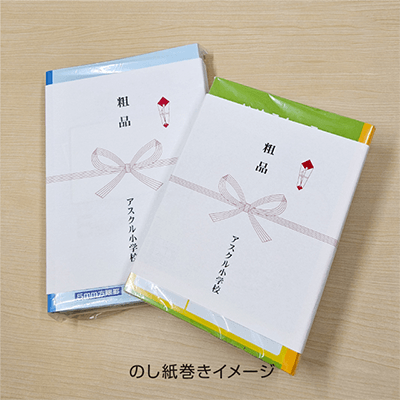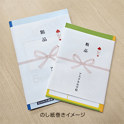 小学生の定番の5mm方眼ノートに名入れのし紙を巻いてお届けします。
