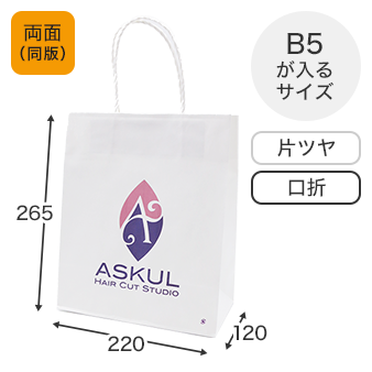 手提げ袋幅220×高さ265×マチ幅120_晒片ツヤクラフト100g(白)_丸紐(白)_両面印刷