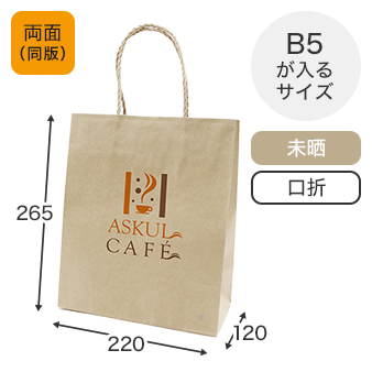 手提げ袋幅220×高さ265×マチ幅120_未晒クラフト100g(茶)_丸紐(茶)_両面印刷