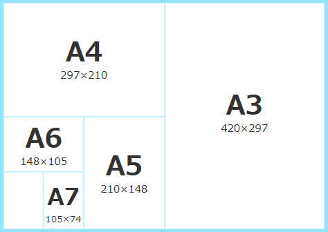 A判は、日本で最も一般的に流通している用紙サイズで、19世紀末にドイツの物理学者、オズワルド氏が考案したISO国際規格のサイズです。A0サイズからありますが、チラシにはA3サイズからA7サイズまでがよく使用されます。