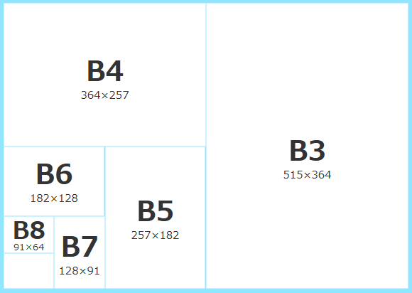 B4サイズは364×257mmで、新聞紙の約半分の大きさです。賞状や原稿用紙などのほか、新聞折込チラシによく使用されます。